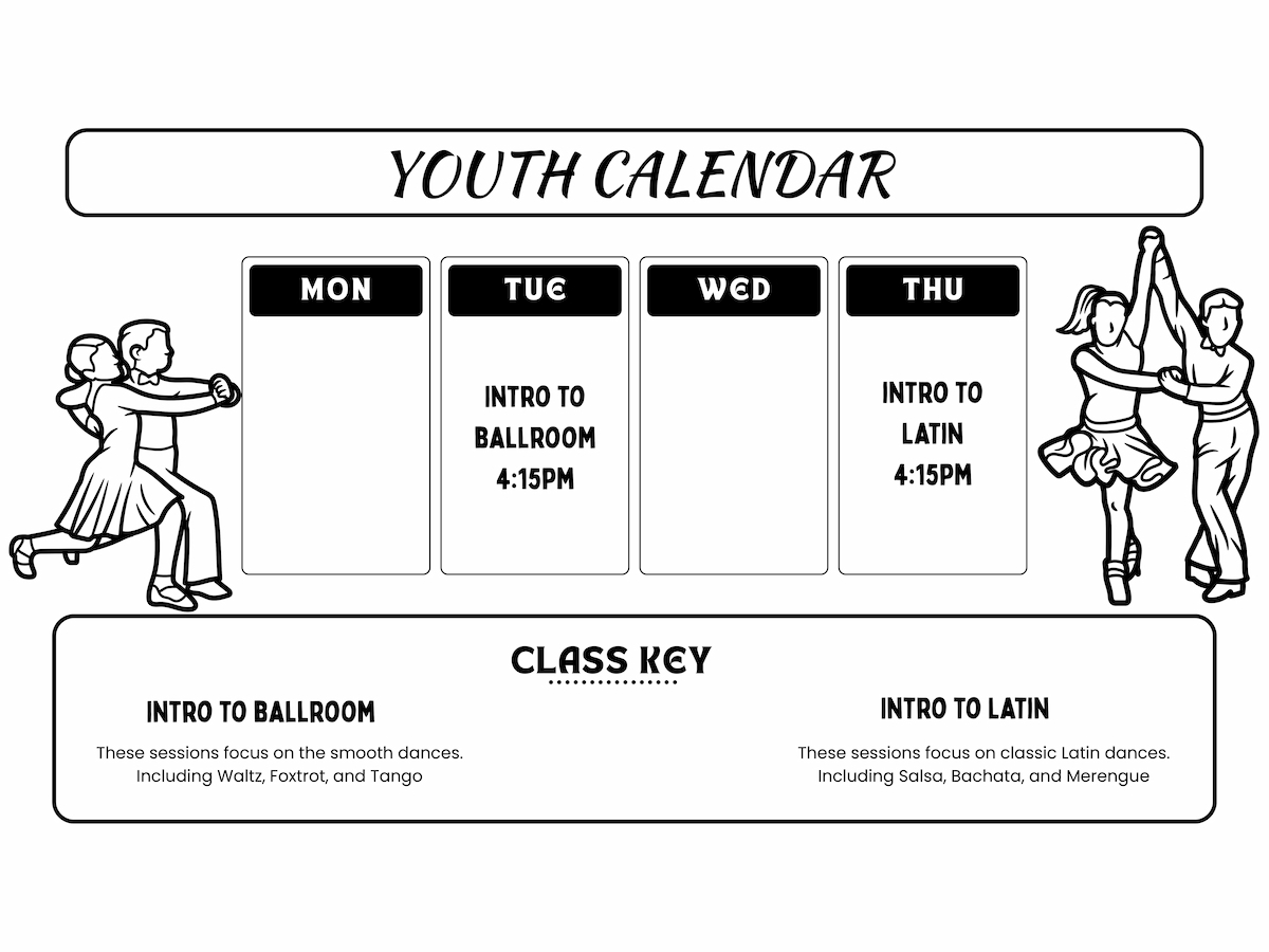 Students should wear comfortable clothes that are easy to move in. For footwear, somthing with a back that won't easily fall off; ballroom shoes, ballet slippers or jazz shoes are acceptable. Hair should be pulled out of students’ faces and accessories (such as headbands, long necklaces, or bulky jewelry) that may become a distraction are discouraged with the exception of accessories students require to focus.